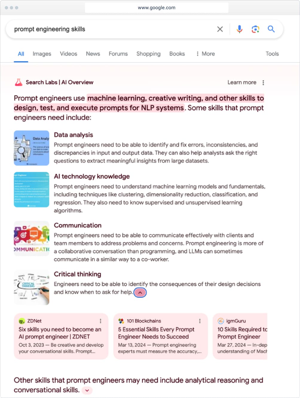 In education, we observed the most significant changes pertaining to broader informational queries related to degrees and specific tests. However, there is a higher likelihood of AI Overviews appearing when users search for specific skills, such as business development skills or prompt engineering skills.