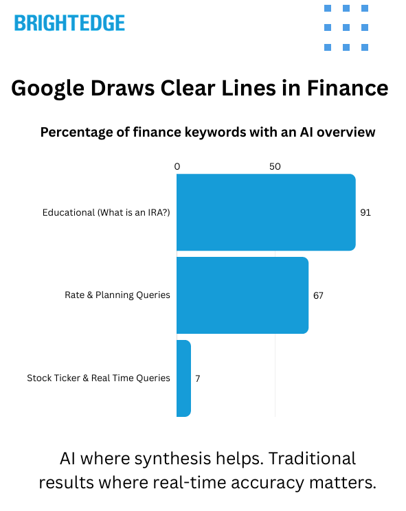 A large portion of Finance search is real-time queries — stock prices, tickers, market data. Healthcare doesn't have an equivalent. Google keeps AI out of real-time data for good reason: you need accuracy, not synthesis.