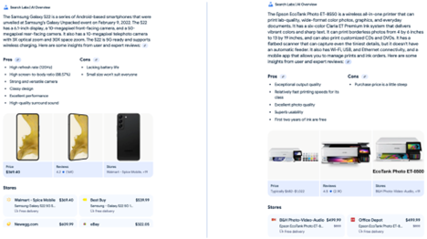 The most dramatic transformations occurred in categories where users typically spend significant time researching before purchasing. Here, we saw a 52% increase in detailed product overviews that include modules such as the pros and cons, product visuals and stores that carry the product (note we began observing these faceted formats in July, but the holiday weekend was a significant expansion). When users searched for "samsung galaxy s22 ultra" or "epson 8550", AI Overviews created comprehensive comparison environments over the holiday weekend. Similarly, home appliance queries like "masticating juicer" or "convection oven" saw AIO’s with detailed breakdowns with facets to help inform purchase decisions.