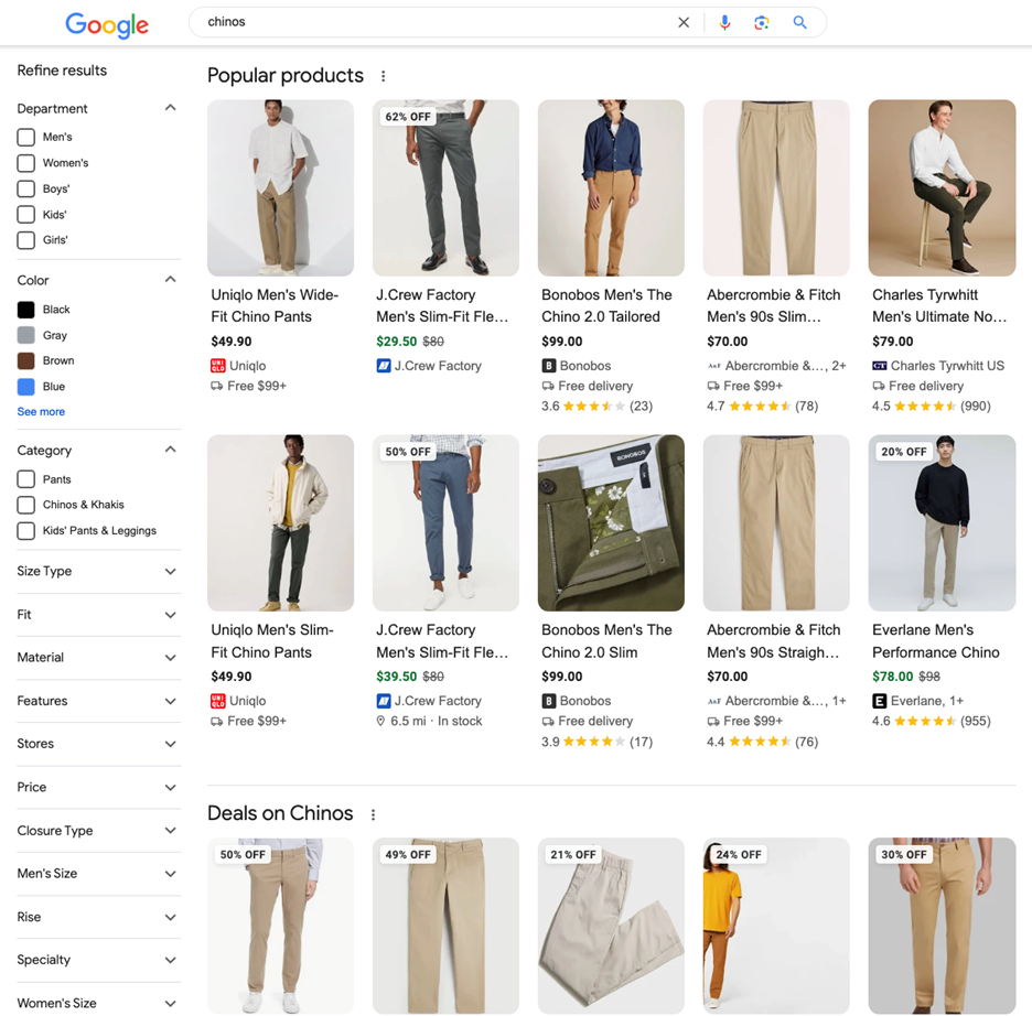 An example of how this discrepancy between a logged in and non-logged in search experience appears is for the term “Chinos”. When logged in, an AI Overview appears with an apparel product carousel along with fashion guidance on what wear with chinos :