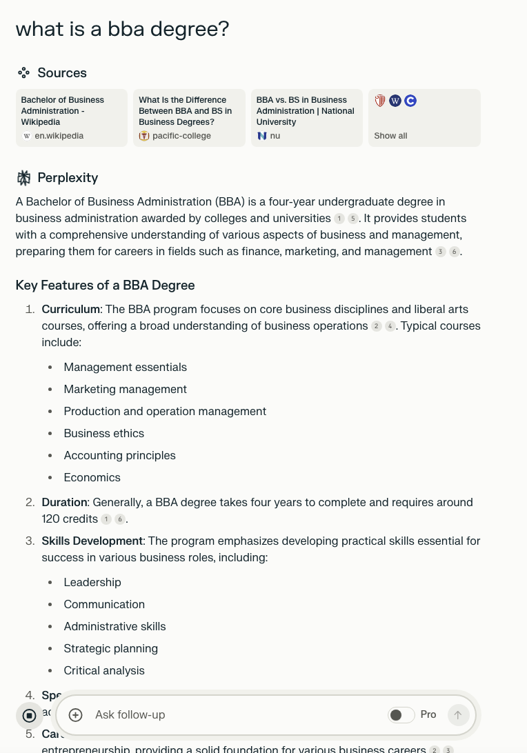 ChatGPT Search: Free for everyone as of December 2024. Especially strong at giving complete, detailed answers. For example, when asking about a BBA degree, it goes beyond basic facts to include valuable career context and job prospects - giving you the full picture in one clear response.
