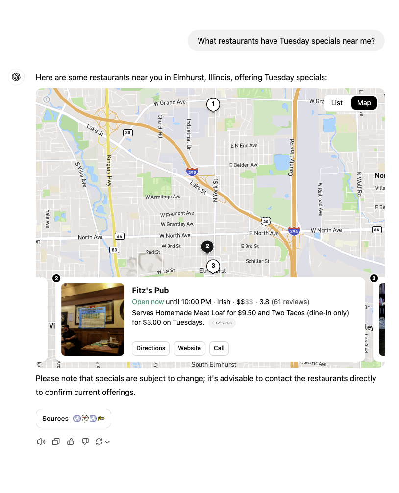 Local queries like "What restaurants have Tuesday specials near me?" highlighted key differences in handling location-based information: