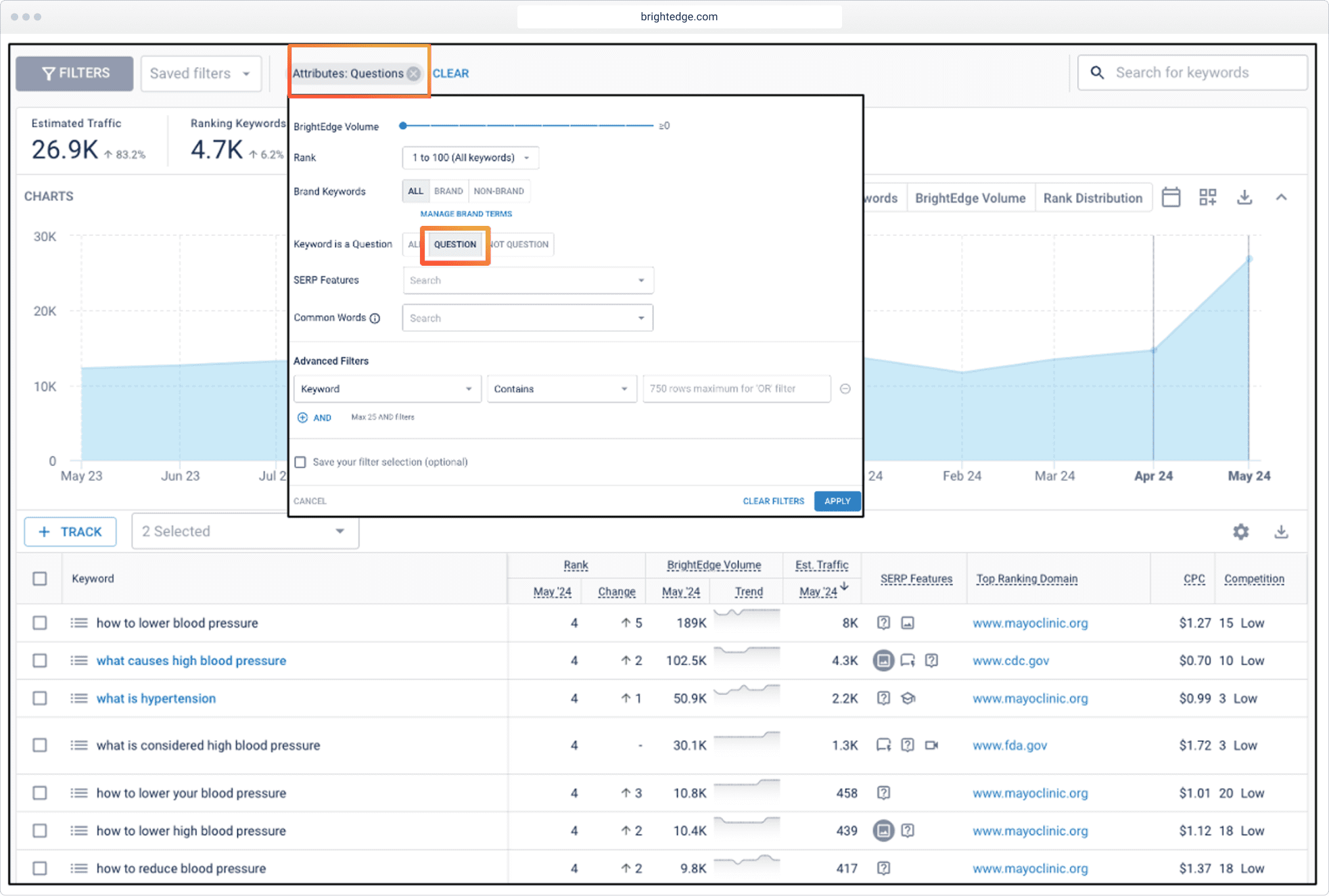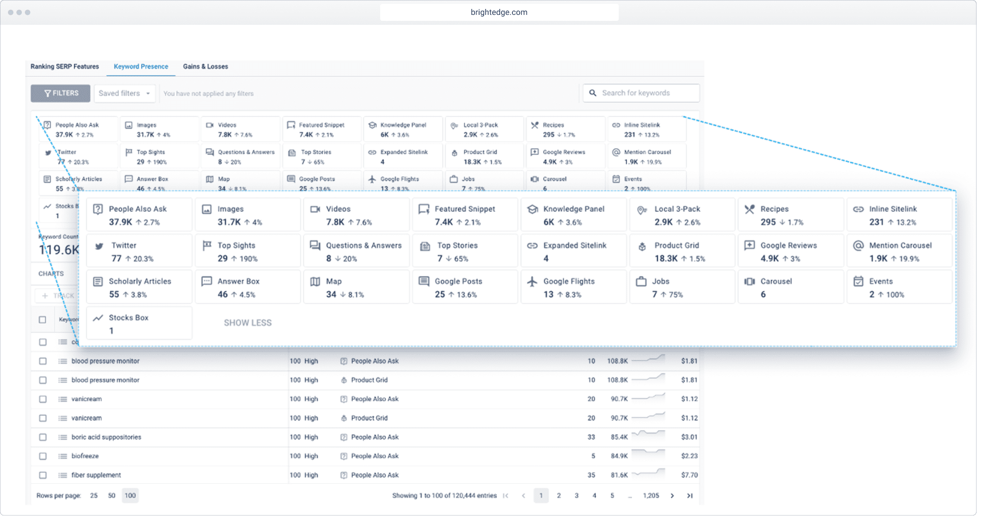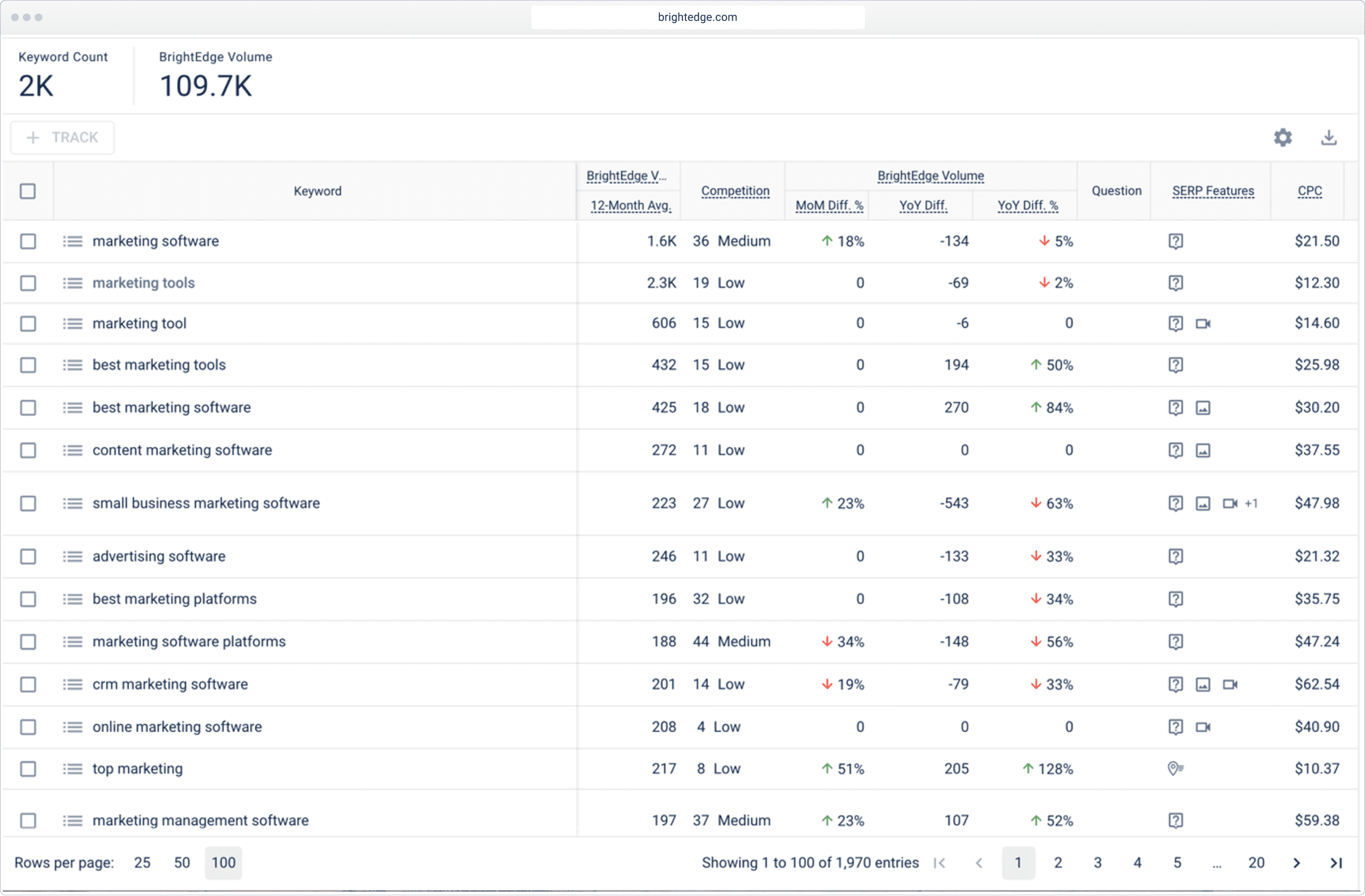 Data Cube X takes the heavy lifting out of keyword research. Its user-friendly interface lets you research an entire domain, website section, single page or keyword. From there, you can quickly identify opportunities for existing or new content, uncover competitive insights, or take advantage of emerging trends. In addition, Data Cube X exclusively features BrightEdge volume, which uses big data analysis and AI algorithms to restore the precise exact match search volume that was lost when Google switched to broad search volume. These unique capabilities eliminate guesswork when prioritizing keywords, identifying close variants that matter, excluding misspellings, and much more.