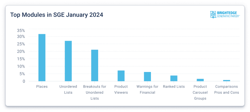 The formats that are most prevalent in SGE results continue to evolve. In the past month, Places have become the most common content module to appear in SGE results. In December 2023, unordered lists were the most common content module.