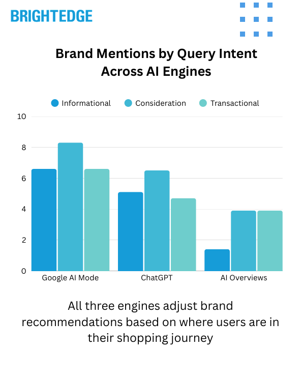 Key Finding: All three AI engines adapt brand recommendations based on query intent, with consideration queries showing 26% more brand competition than transactional queries. Google AI Mode peaks at 8.3 brands for consideration, while Google AIO mentions only 1.4 brands for informational queries despite appearing 30.3% of the time.