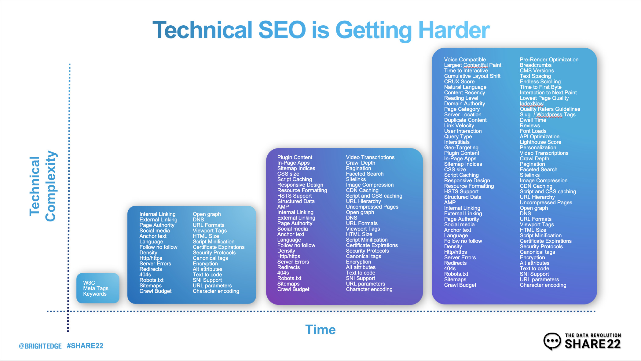 The focus for discoverability used to be almost solely centered on getting URLs indexed. Today we want search engines to not only index a URL, but to understand the context of the page, the format of the content to best match it to the right type of search results, and dozens of other signals embedded in our content and on our sites. Technical SEO is our best shot at controlling whether and how our content ranks in search. Consider the simple chart below, which puts in stark relief how progressively complex technical SEO has become.