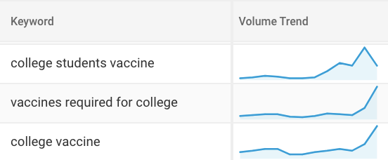 So, what are users searching for as it relates to school? Vaccinations. College students and their parents are inquiring about vaccinations for university students. It would benefit all universities to add vaccine-based information to their websites. Below you can see the immediate increase in vaccine-related searches beginning in November 2020.