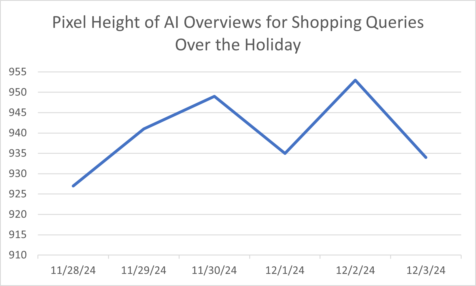 As BrightEdge Generative Parser™ monitored shopping keywords over the holiday weekend, it showed that AI Overviews didn't just grow in number; they grew in complexity. Average Overview height increased from 941px to 953px as presentations became richer and more detailed.