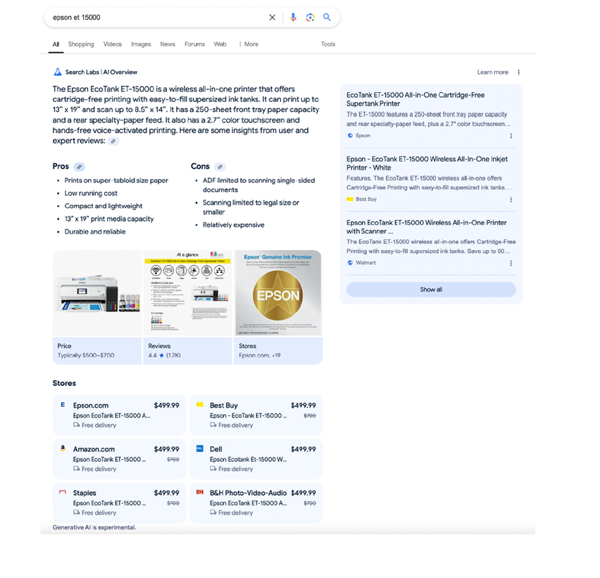 Over the course of the holiday weekend, we observed a shift in the way AI Overviews present information. They became more elaborate and shoppable, particularly for specific product queries such as an “Epson et 15000” printer. These product viewers offer multiple details about the product such as an overview, pros and cons and where to get the best deal on them.