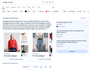 Fashion and home décor queries revealed AI's growing sophistication in handling visual intent. Searches for items like "cardigan sweaters" triggered a product viewer format optimized for style comparison.