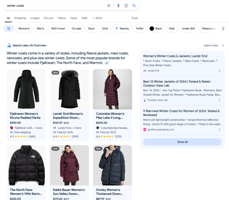 In addition, category-level keywords like “winter coats” showed group carousel formats that made these queries more shoppable while maintaining their style context.