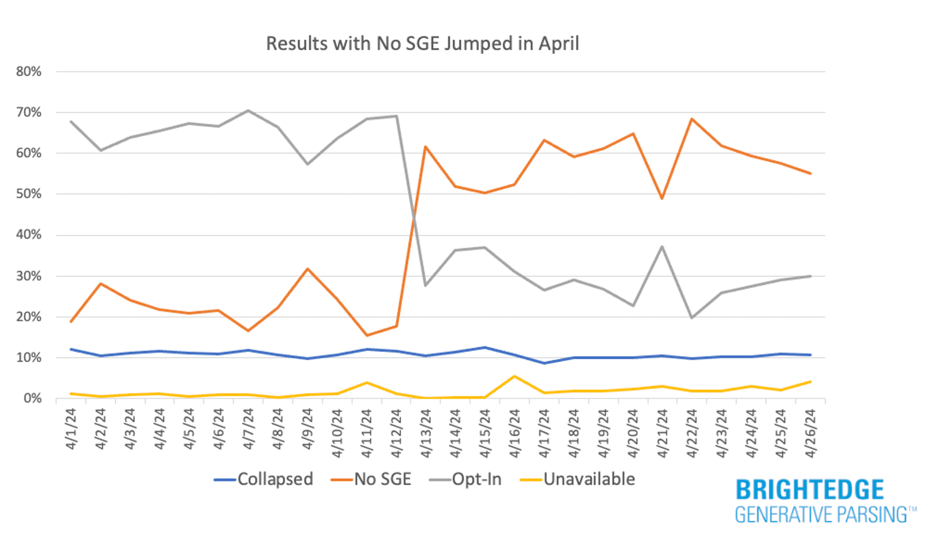 Starting around the middle of the month, we saw Google significantly pull back on the results where they were showing SGE results. The drop was largely at the expense of Opt-In results, which are usually the most common type of result to appear. Collapsed results seem largely unaffected by this shift.
