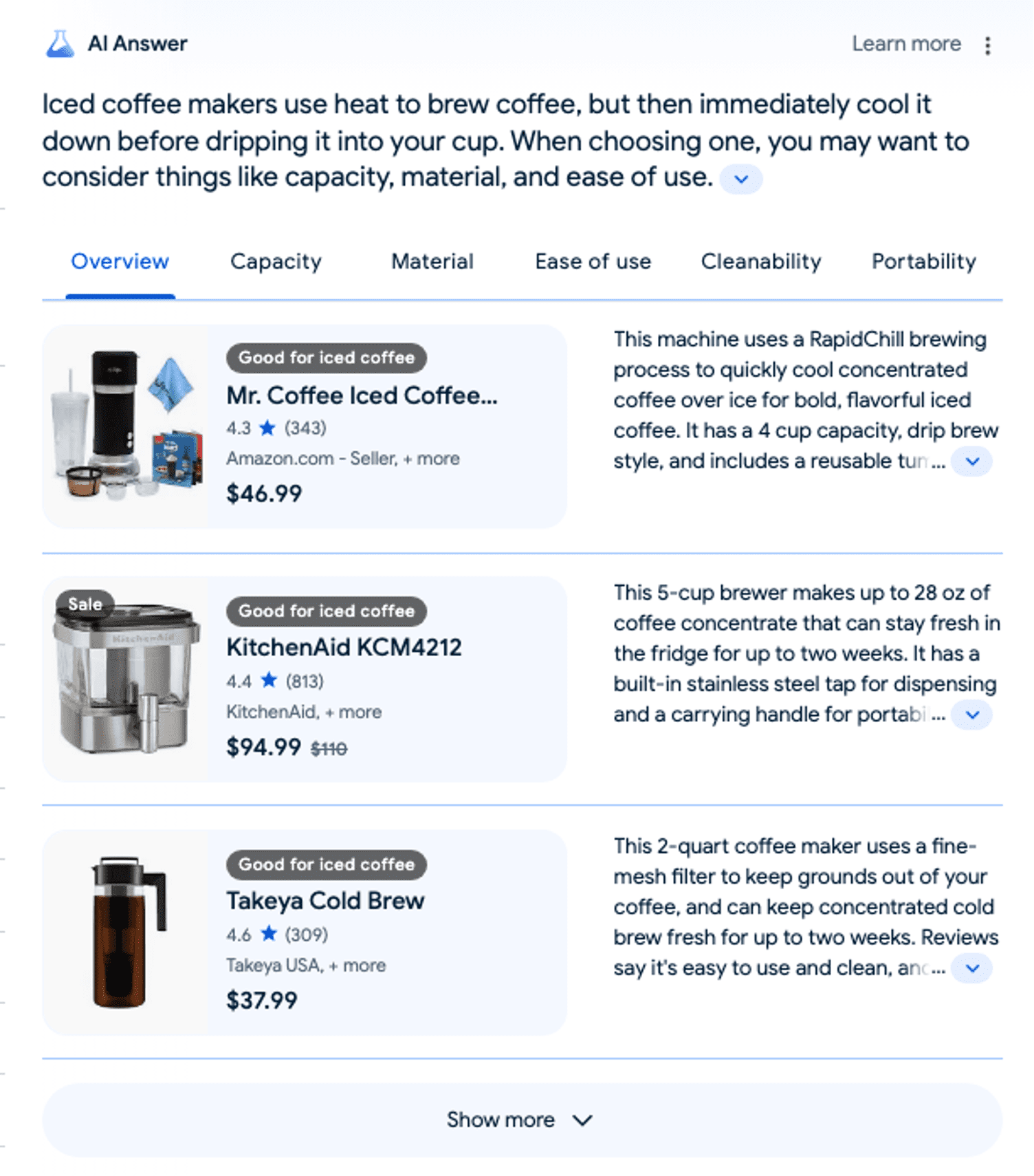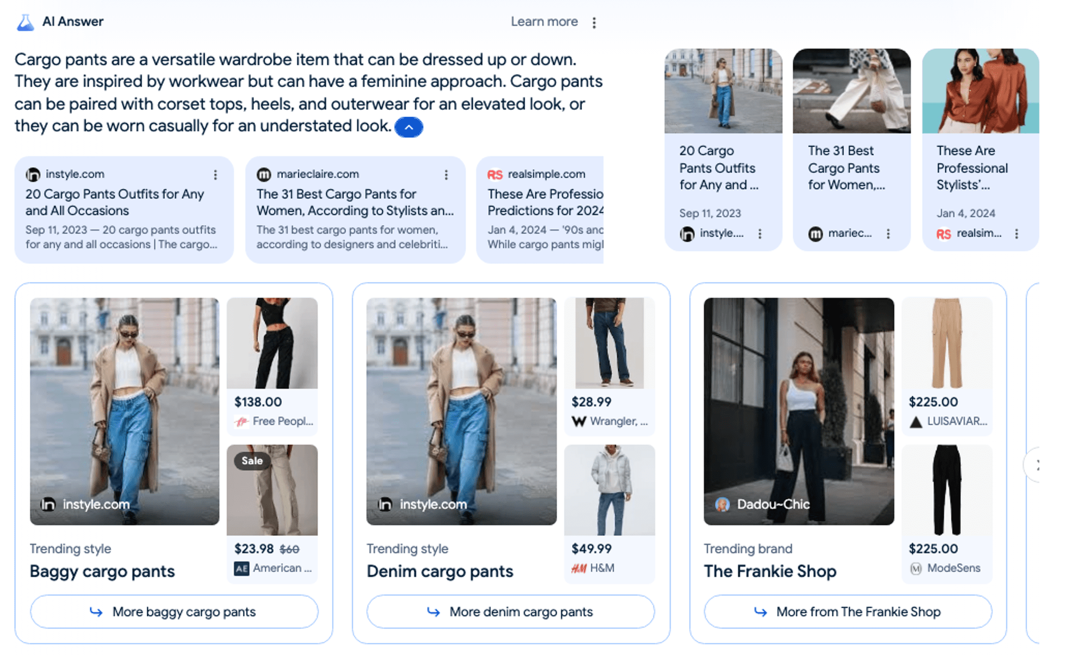 Last month, we observed that Google SGE results were appearing smaller on the screen. This trend has continued, with Google experimenting with smaller display sizes towards the end of this month. As mentioned earlier, we are witnessing a shift to carousel-style shopping results, which tend to take up less space on the screen, a change that seems to be validated by recent observations. Ultimately, as we approach a broader release, this trend towards a smaller footprint suggests that traditional organic results will continue to play an important role and remain visible for most users. It also indicates that SGE is becoming more effective at delivering valuable answers in concise ways.