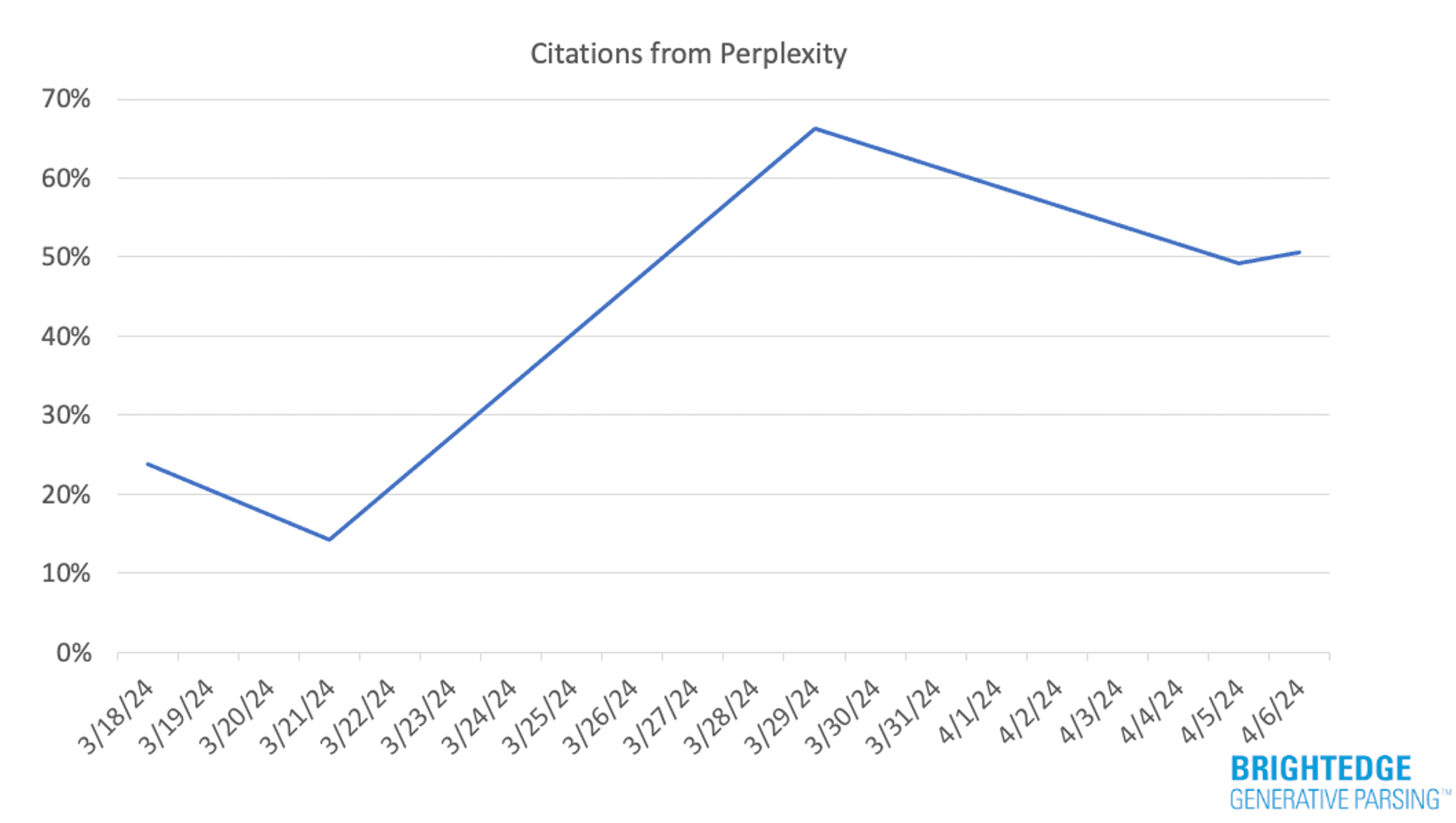 One thing that differentiates Perplexity from Google SGE citations is that, rather than relying on the entirety of Google’s index, Perplexity gives priority to a curated group of trusted sources. This means that marketers interested in driving referral traffic from Perplexity need to pay attention to which sites Perplexity is citing most frequently. In April, the BrightEdge Generative Parser™ detected some significant jumps in visibility for Yelp: