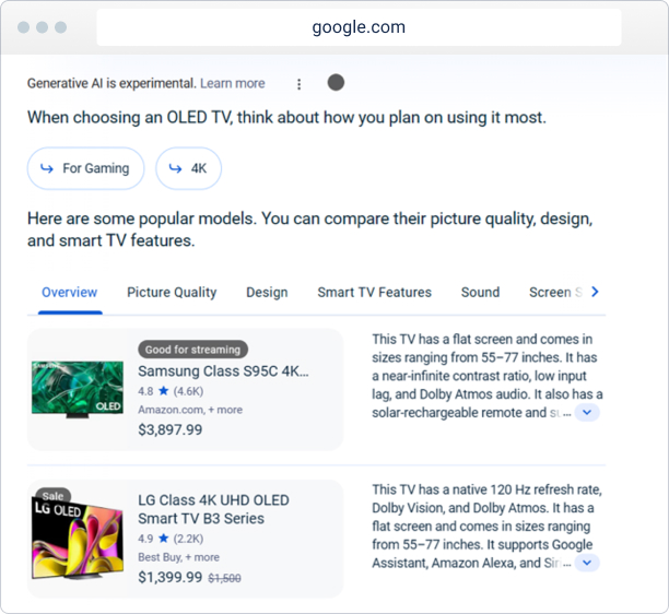 Now, users are getting information for what to consider very specifically for gaming TV’s. This level of specificity in search results empowers users to make more informed decisions by understanding exactly what to consider for their individual needs. For SEO professionals and content creators, this development underscores the increasing value of long-tail content—those details that surround a product, like use cases, benefits, and specifications. As Google assists users in narrowing down their exact preferences within the search results, the significance of this detailed content becomes even greater. It's expected to be a more influential factor in attracting highly qualified traffic moving forward.
