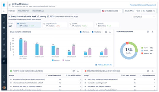 See how your visibility evolves over time through citations and mentions. Monitor your presence and agentic AI visibility across AI Overviews, ChatGPT, and beyond. - Understand Variations in Brand Mentions Across Key Prompts