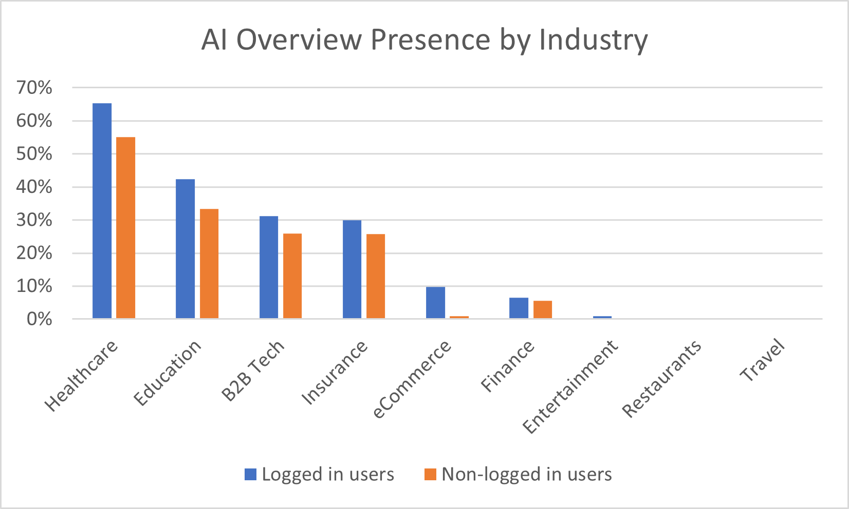 - Healthcare: AI Overview presence was 10 percentage points lower for non-logged-in users compared to logged-in users, resulting in a 16% relative change. This smaller difference suggests a more deliberate rollout in the healthcare sector.