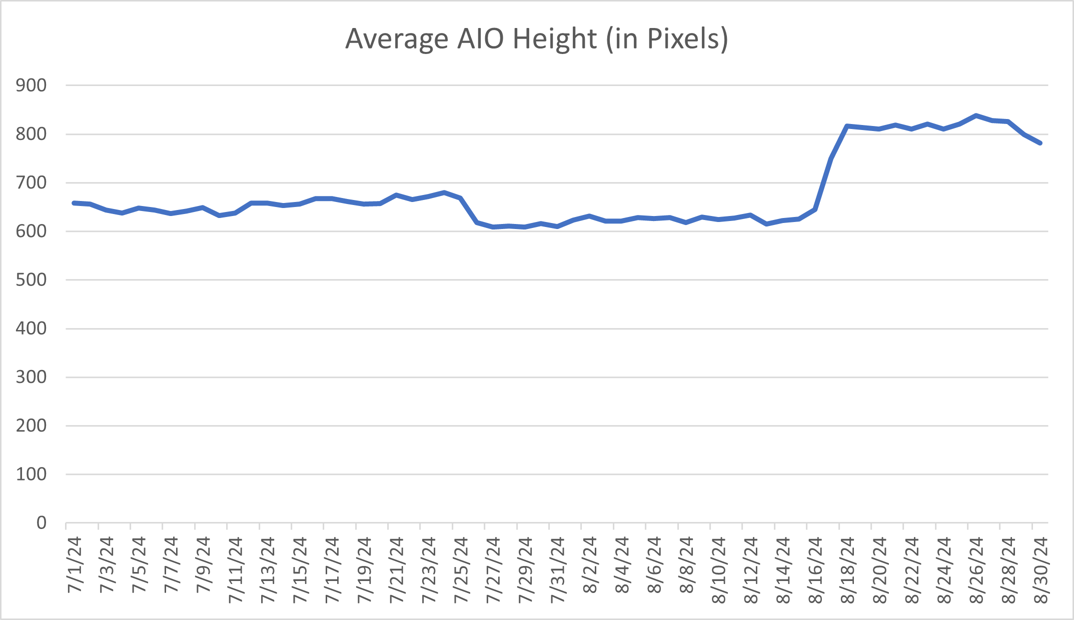 One of the most notable changes observed in August is the significant increase in the height of AI Overviews. This is important because, for several months, BrightEdge Generative Parser™ had detected a continuous reduction in the size of the AI Overview panel. However, the average height of AI Overviews rose by 10%, from 647 pixels in July to 712 pixels around August 18th. This increase may seem subtle at first glance, but it has profound implications for how AI Overviews present information and what it means for marketers looking to optimize their content for visibility. Additionally, this height increase coincides with the rollout of AI Overviews to non-logged-in users.