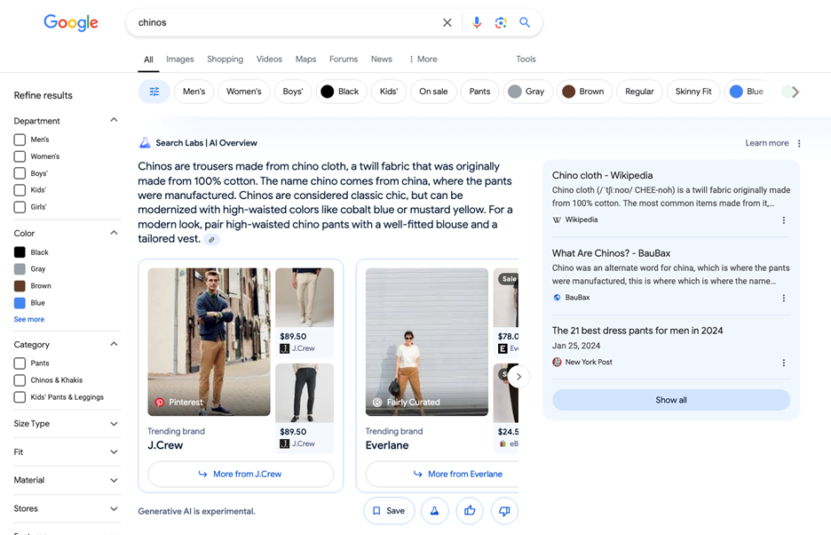 An example of how this discrepancy between a logged in and non-logged in search experience appears is for the term “Chinos”. When logged in, an AI Overview appears with an apparel product carousel along with fashion guidance on what wear with chinos :