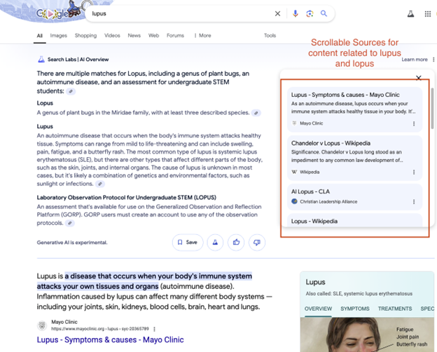 Interestingly, these new sources do not increase the size of the AI Overview panel on their own, as the box is scrollable, making it easy to read both the AI Overview response and browse for more information. Additionally, users can now click on the link icon to get a specific view of the citations for that section of the answer. This is particularly useful for informational queries, such as 'lupus,' where the intent may be ambiguous. Now, if users find exactly what they want to learn more about, they can pinpoint it directly in the result and dig deeper into the subject.