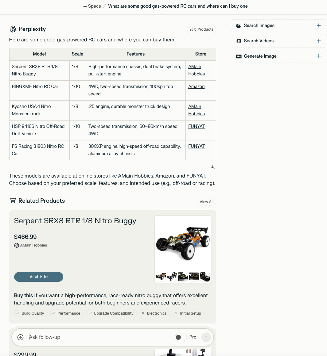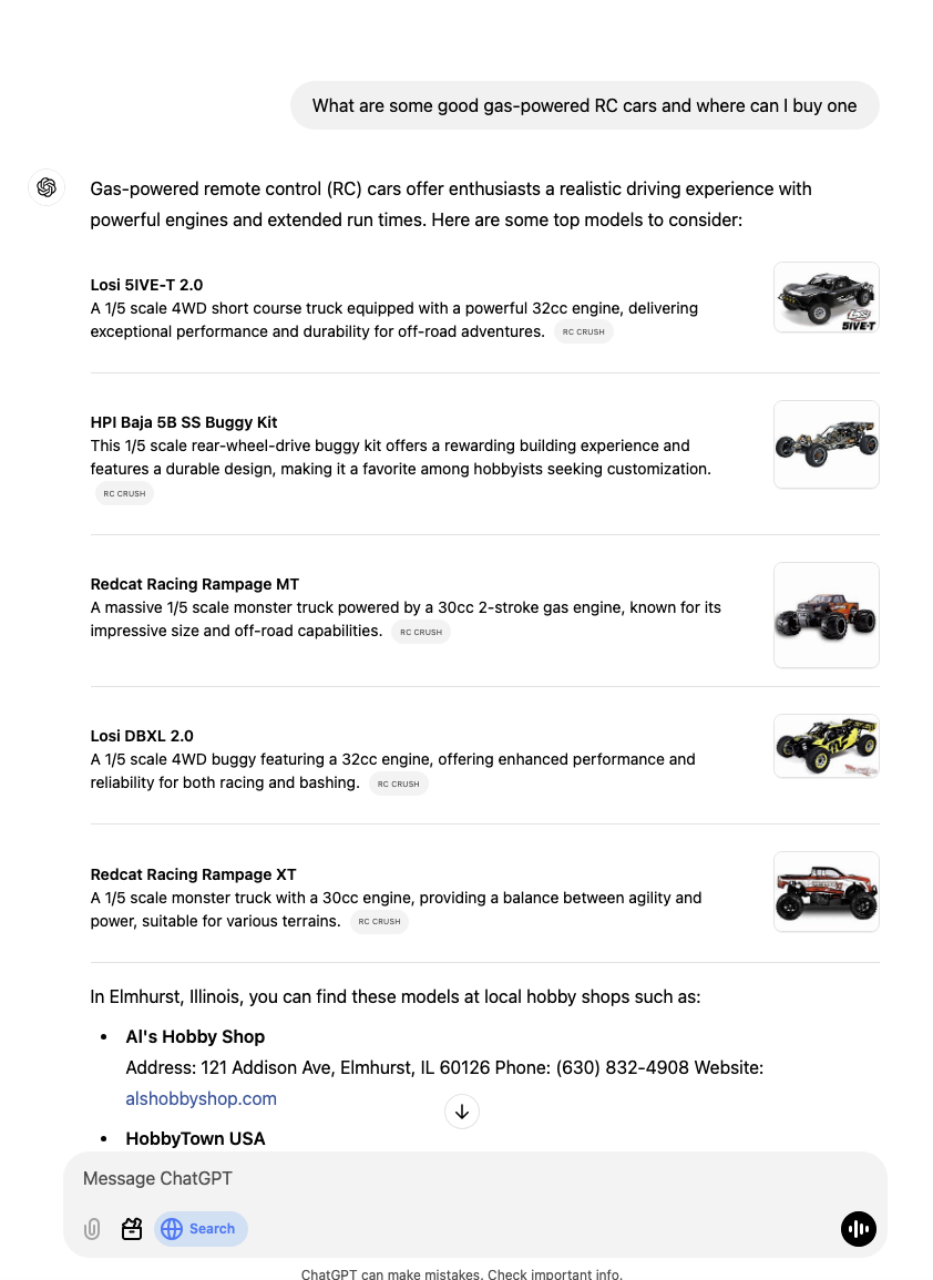 Shopping queries like “What are some good gas-powered RC cars and where can I buy one?” revealed different approaches to purchase guidance: