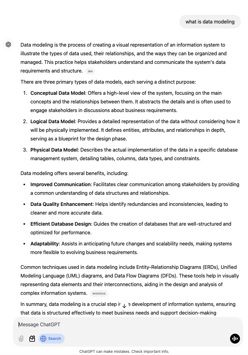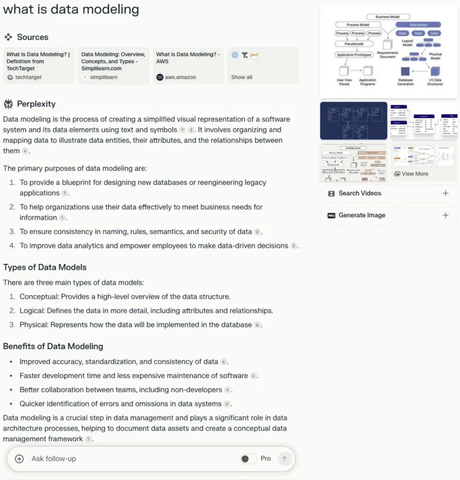 Perplexity: Shines at combining explanations with helpful visuals. When explaining technical concepts like data modeling, it pairs clear explanations with visual examples, making complex topics easier to understand at a glance.