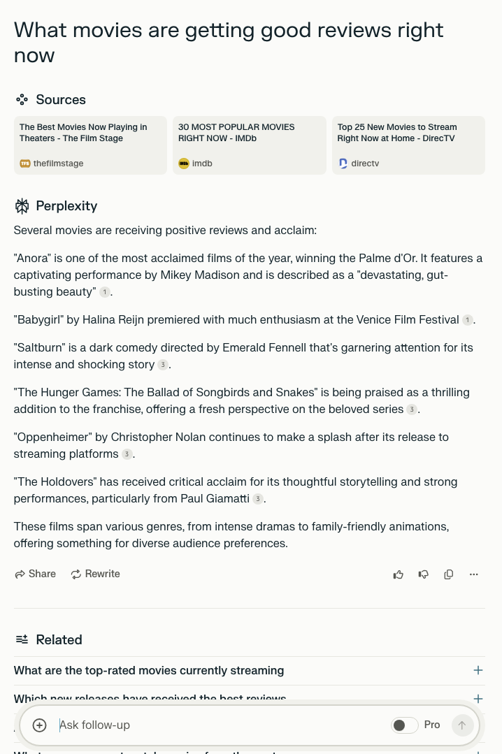 Perhaps the most striking differences emerged in time-sensitive queries like "What movies are getting good reviews right now?":