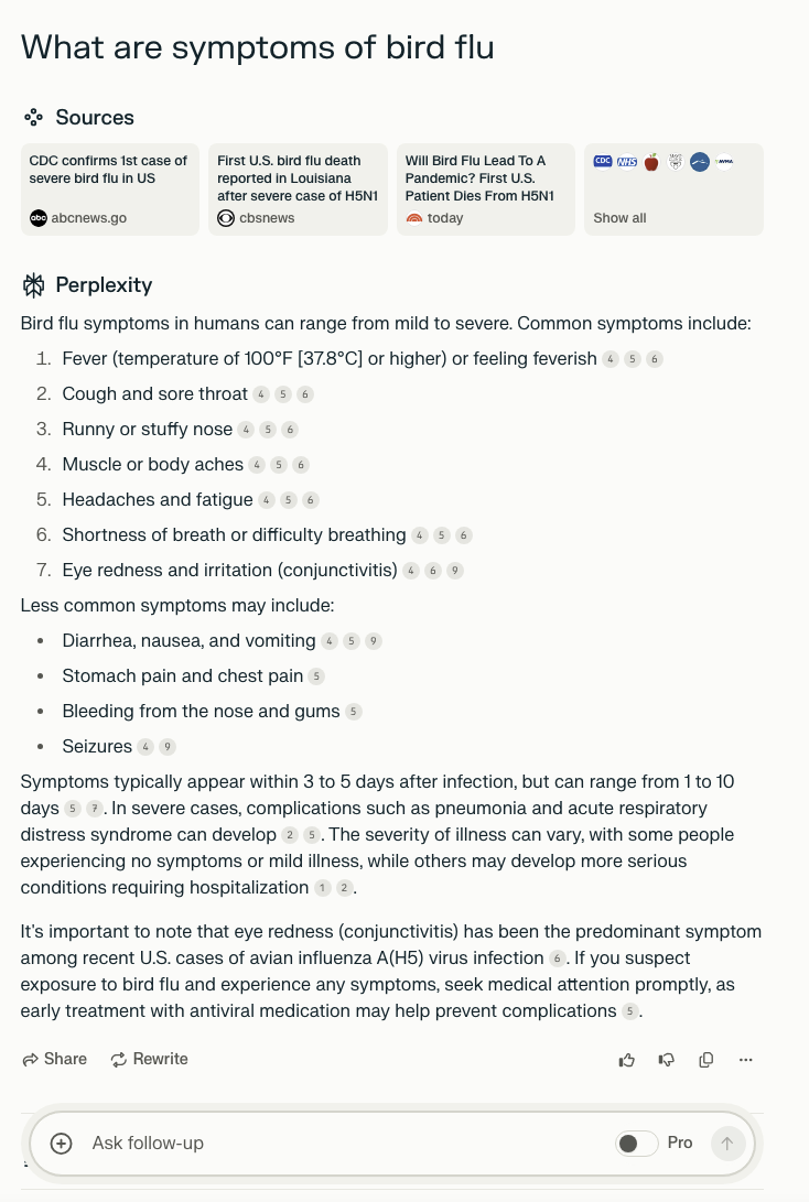 Health-related queries like "What are symptoms of bird flu?" demonstrated each platform's distinct approaches to medical information:
