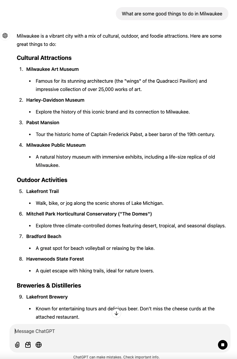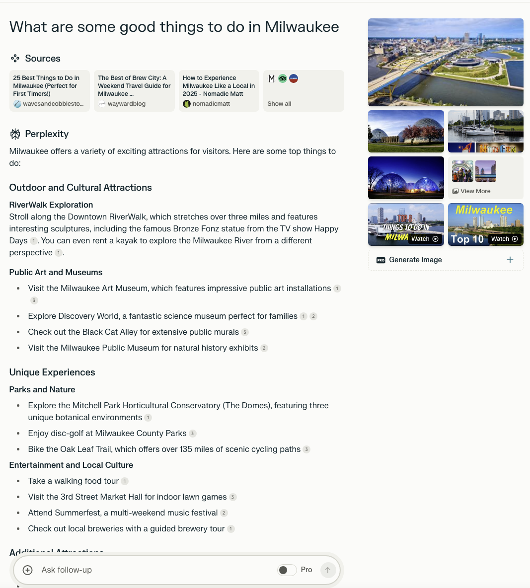 Travel queries like “What are some good things to do in Milwaukee” showed how each platform handles destination-based information: