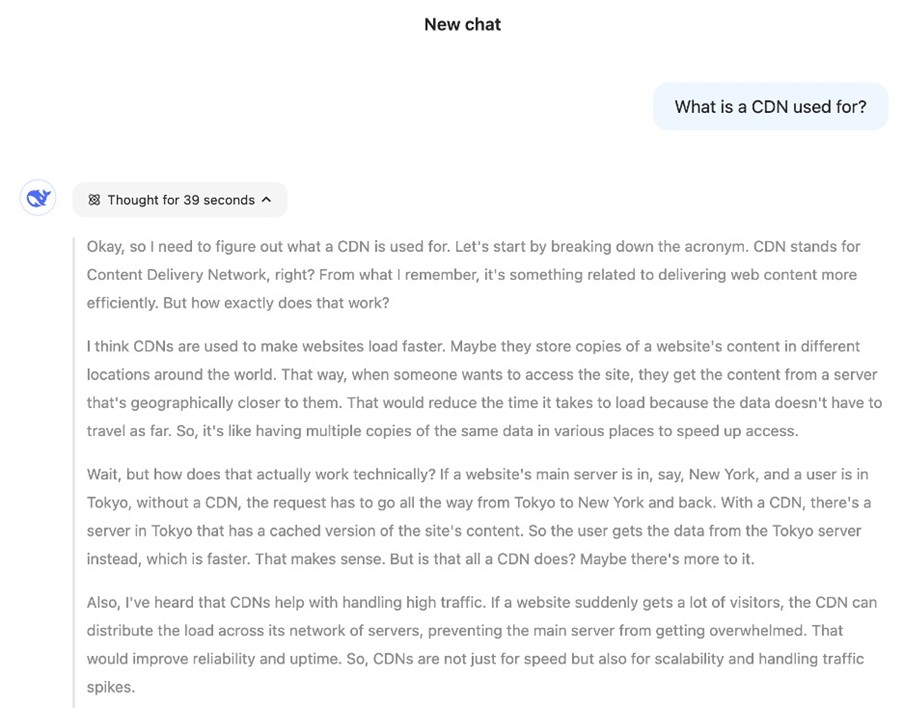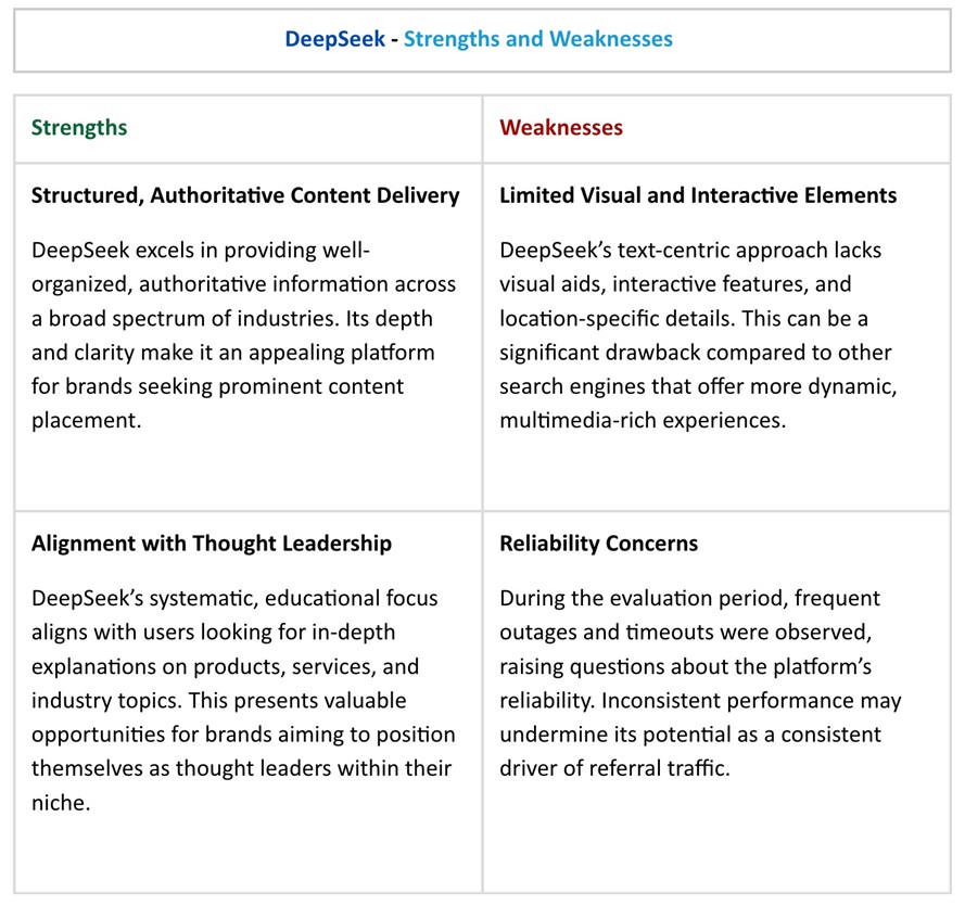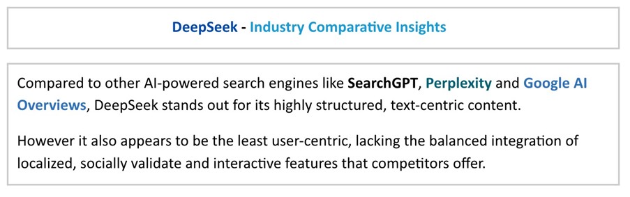 DeepSeek is a generative AI-powered platform that combines advanced reasoning and search capabilities to interact with users, answer complex questions, and provide intelligent, context-aware solutions. What sets DeepSeek apart from other AI models is its ability to produce detailed, contextually rich responses while using significantly less power and processing resources. It has the ability to reason and demonstrate how it is reasoning, creating transparency that hasn’t always been visible in other LLMs (note, OpenAI updated its latest ChatGPT o3 model to show more reasoning after the release of Deepseek). So far, Deepseek’s answers and reasoning capabilities have been found to be competitive with major AI players such as AI Overviews, Perplexity and ChatGPT at a fraction of the cost. Its rapid adoption and expanding global influence signal a broader shift toward more intelligent, context-aware search experiences.