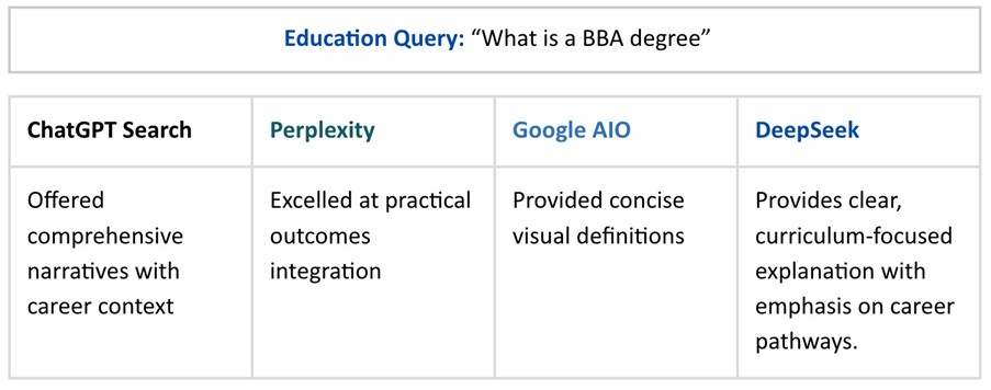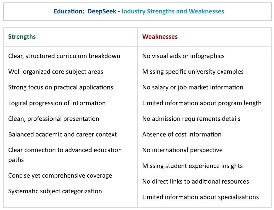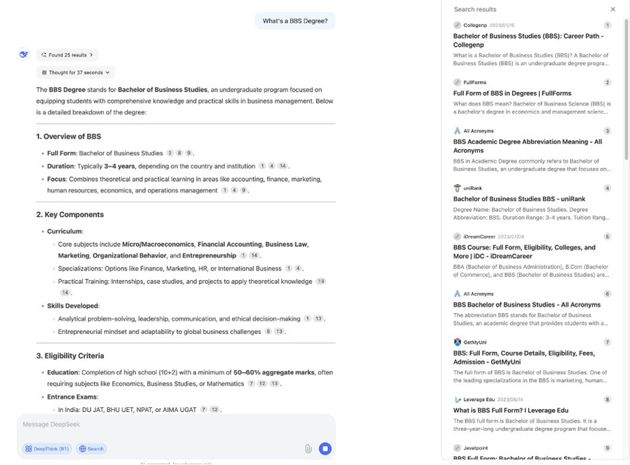 Overall, DeepSeek's response to the education query seems to provide a clear, structured overview of a BBA degree program, with a strong focus on practical applications and career pathways. While it lacks some visual elements and specific institutional details, its systematic approach and balanced coverage make it a helpful starting point for understanding the core aspects of this business degree.