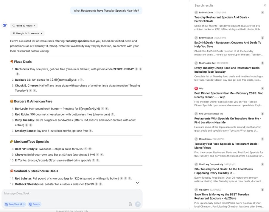 DeepSeek's AI reveals sophisticated handling of both temporal and geographic constraints. The AI demonstrates clear prioritization between different types of local content: permanent business information (like locations and categories), recurring time-based content (like weekly Tuesday specials), and one-time events (like Super Bowl promotions, which it actively filtered out).