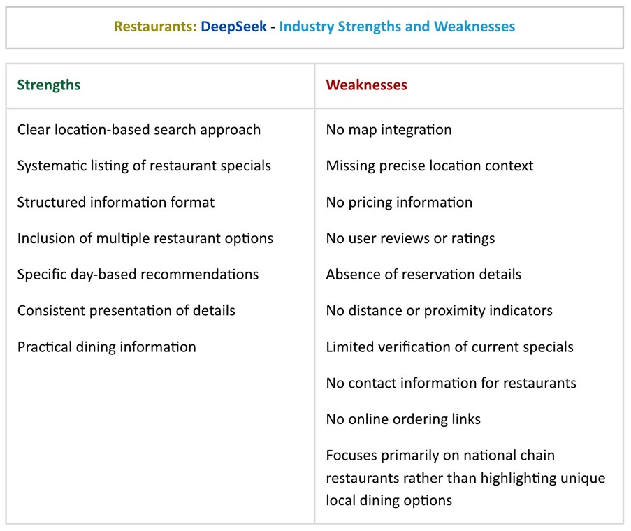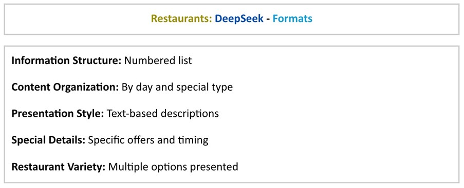 Overall, DeepSeek's approach to the restaurant's query seems to emphasize providing structured, day-specific 'specials' information across multiple options.