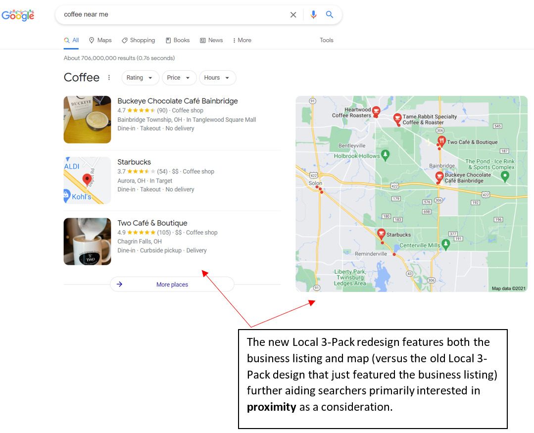 Previously, the relevance of a business listing to the search terms played a greater role in determining the top rankings in local search results. Too often, this meant the SERP would return a search result even if the business was not close to the searcher’s location.