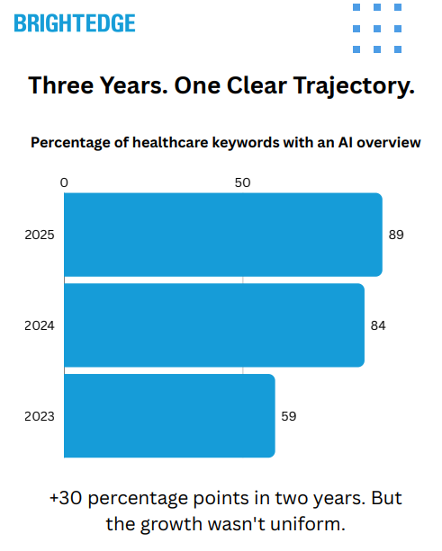 - The Coverage Expansion: Healthcare AI Overview presence grew from 59% to 89% over two years — a 30 percentage point increase. Most growth occurred between 2023 and 2024.