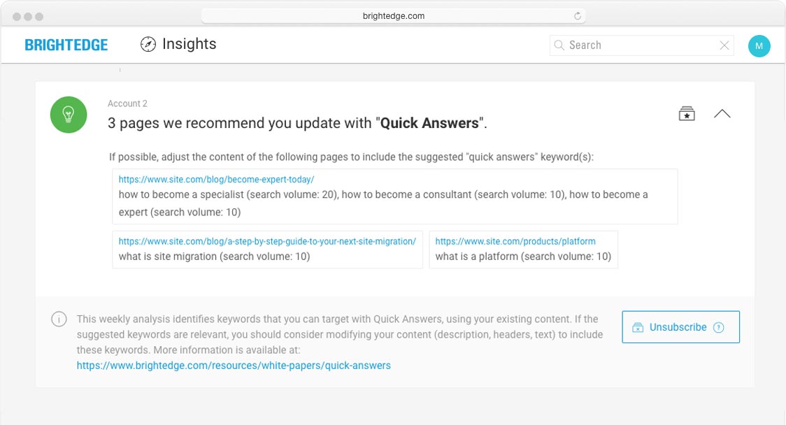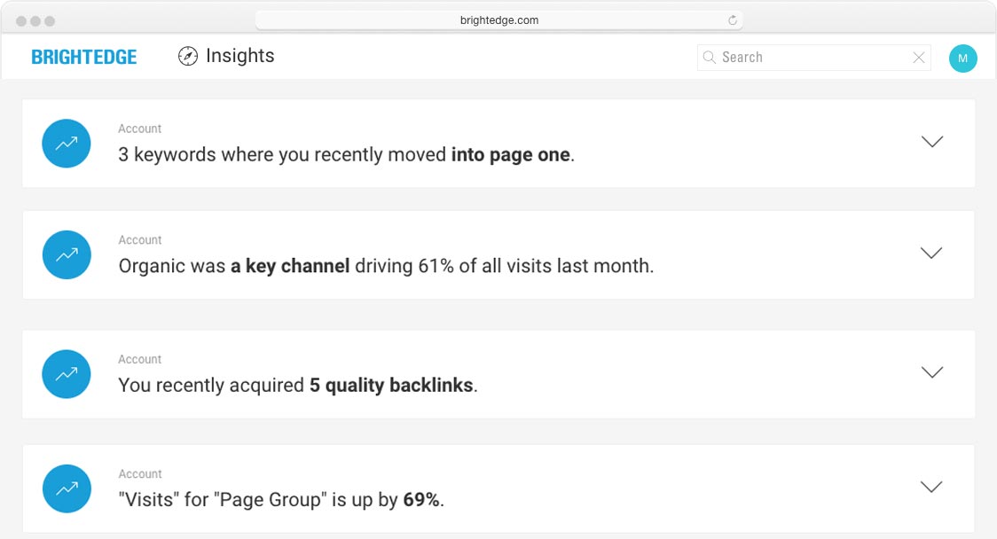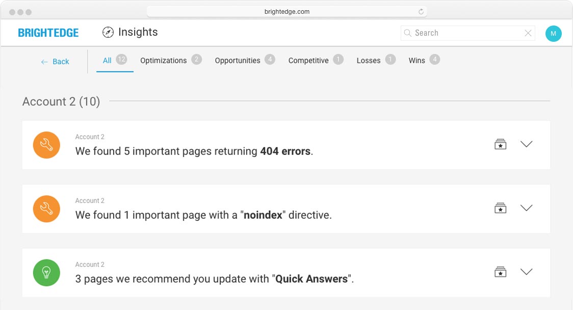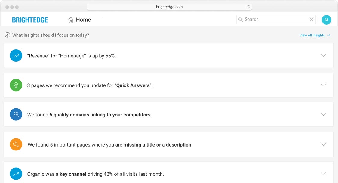 Improve your website with confidence. BrightEdge Insights is your personal data analyst that recommends opportunities to pursue and errors to fix, while highlighting what’s been successful and what competitors are doing.