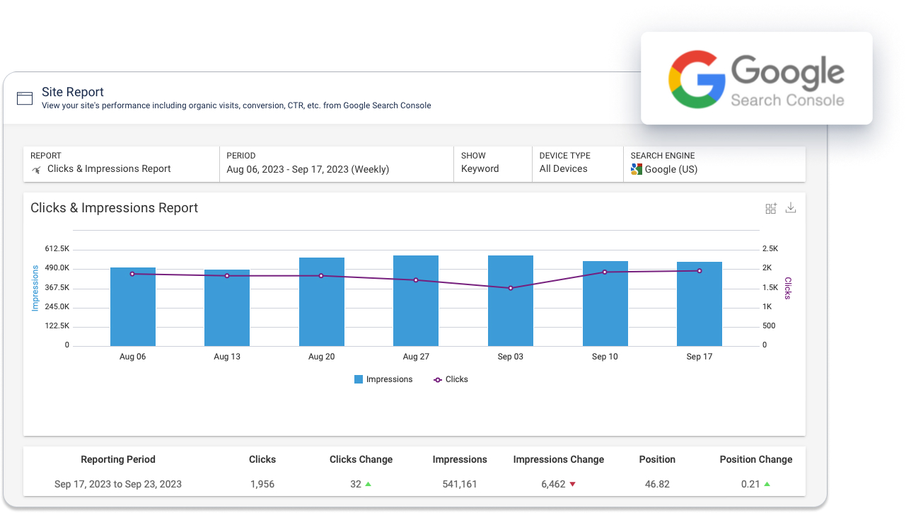 Our Google Search Console (GSC) integration provides you site and keyword-level reporting on Google metrics such as Total Impressions, Total Clicks, Keyword Search Queries, and Click-Through Rates. BrightEdge reports leveraging our GSC integration give you visibility into how your content pages show up on Google SERPs, how that visibility trends over time, and how often customers click on your content links, translating into organic traffic.