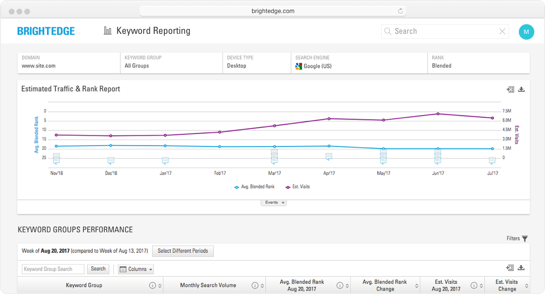 Identify your most valuable keywords, track their performance and prioritize your efforts by gleaning insights from rich data sets, including search volume, ranking position, universal results and more.