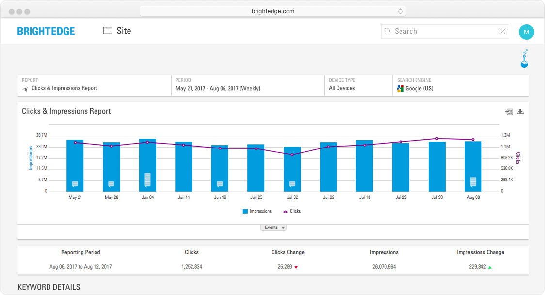 Keyword Reporting's trend graphs give you quick perspective into the performance of your content -- and your competition’s -- over weeks, months, and quarters. Track whether your brand is becoming more visible on top SERPs and in Universal Results. See how impressions, clicks, estimated visits, and revenue trend over time for every topic using BrightEdge’s proprietary measures.