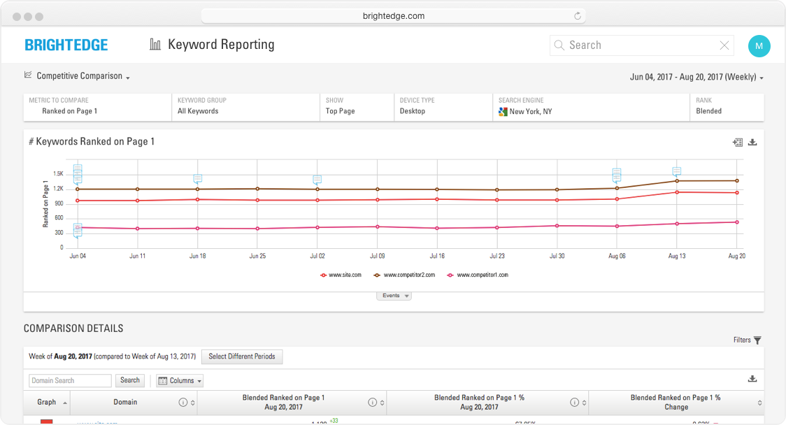 Understand how you perform against the competition at the keyword level. Measure and track share of voice and identify key topics for which you are not currently ranking. Leverage these topics to create content opportunities.