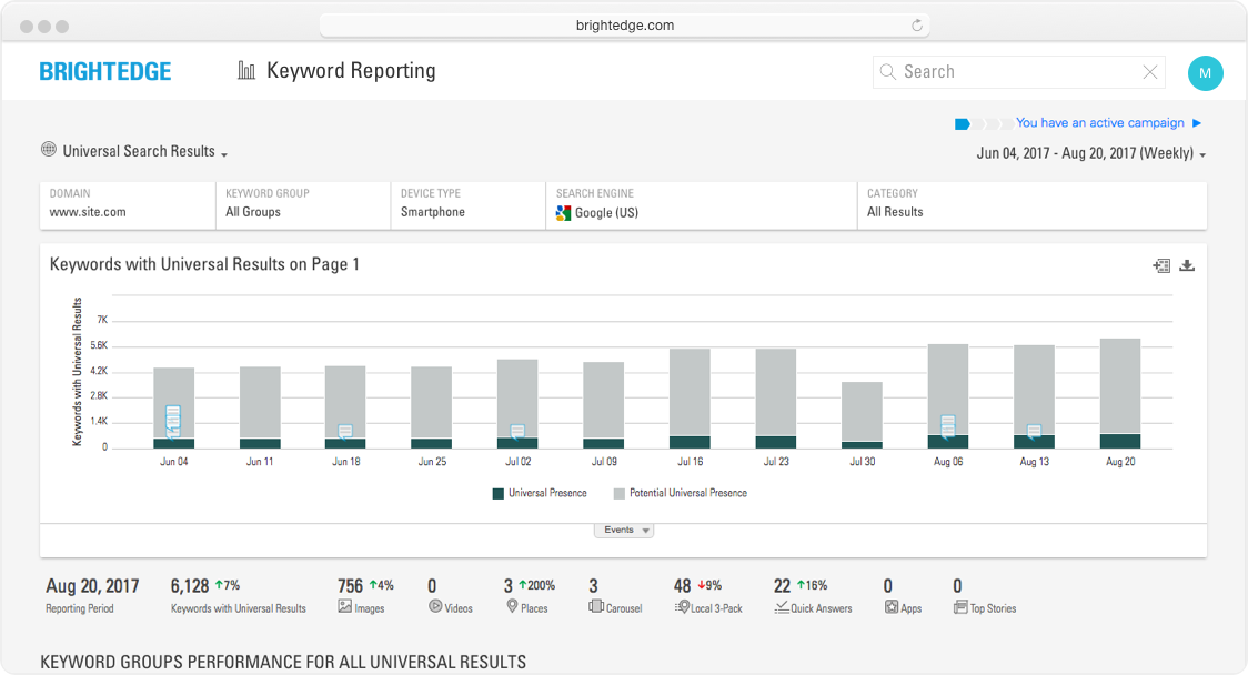 Keyword Reporting provides insights into the how the SERP layout adapts to each keyword. Understand your potential and actual presence in other types of search results, like Google Quick Answers, videos, or Local 3 Packs. Use Intent Signal to track your content presence above the fold on SERPs and to coordinate organic and paid search initiatives to maximize site traffic acquisition.