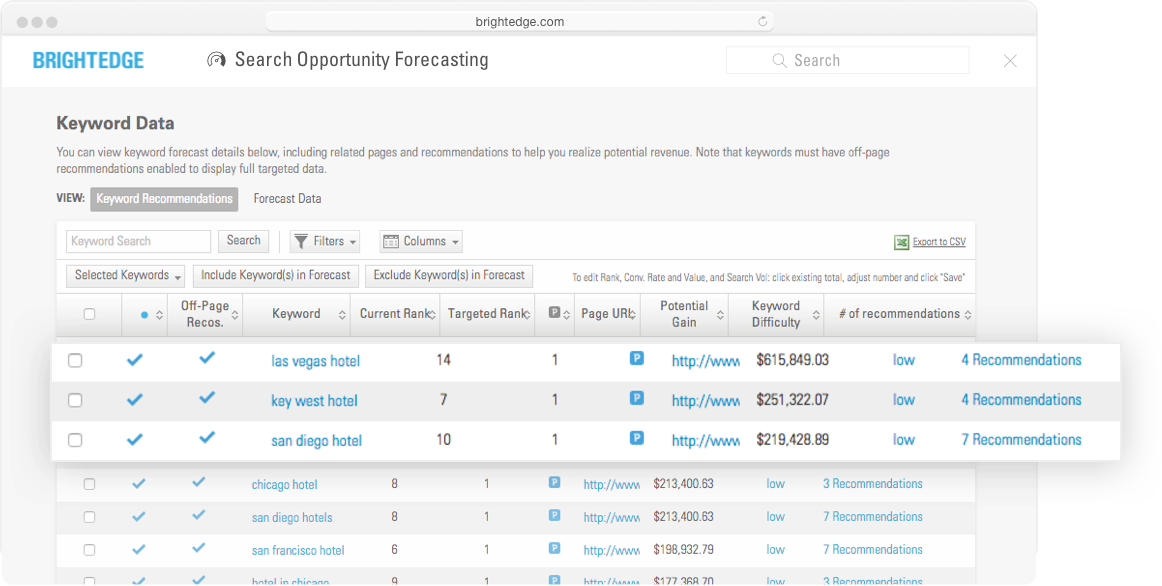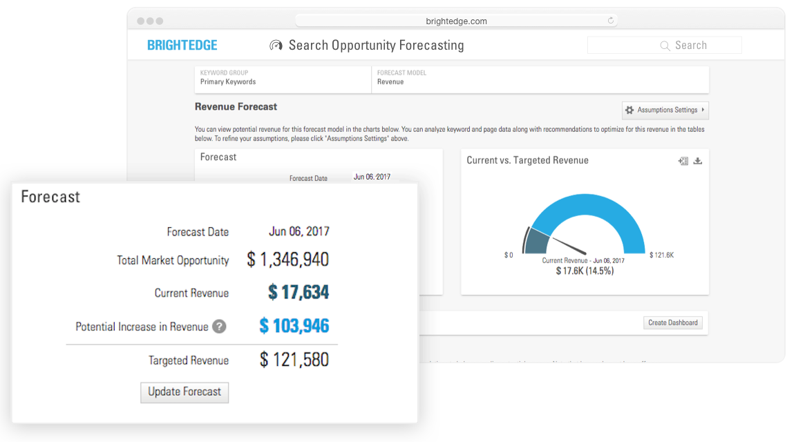 Forecast SEO performance with confidence. Building the business case for SEO has never been easier. Opportunity Forecasting automates the process to calculate the total addressable market and your potential gains in revenue or site traffic with the push of a button. Create campaign targets for your content projects and prioritize efforts based on predicted ROI.