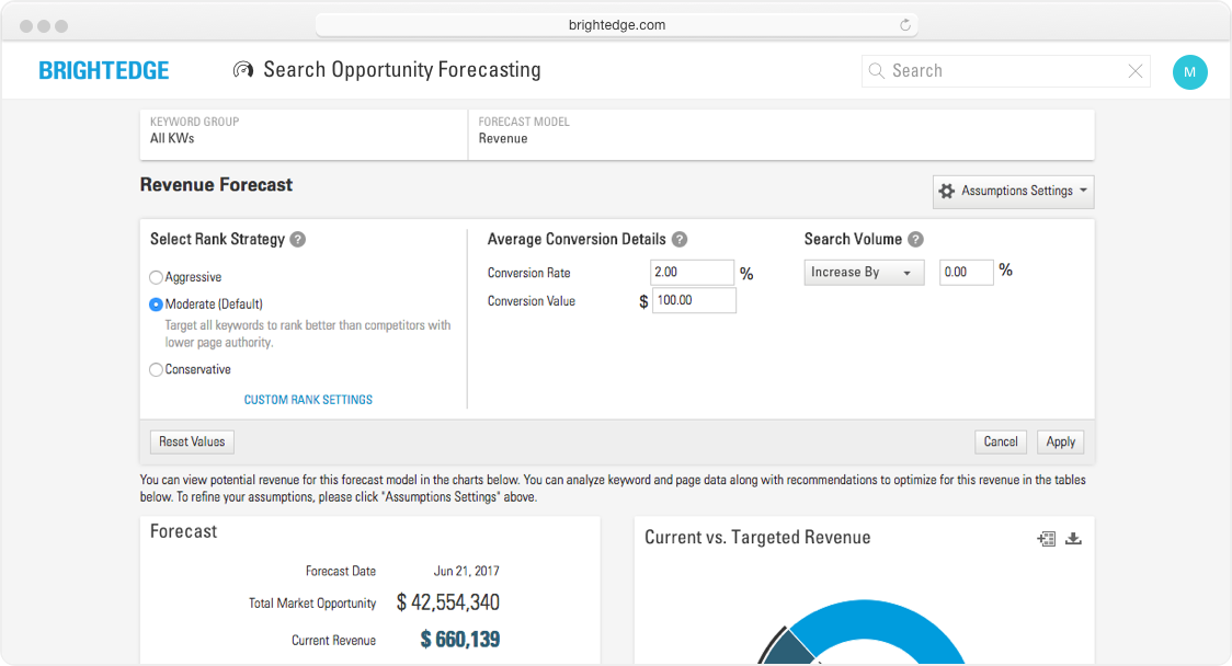 Maximize the reliability and relevance of your forecasts by viewing projections in aggressive, medium, or conservative scenarios. Customization variables include revenue estimates for conversions, conversion rate, search volume increase, or ranking improvement for selected keywords.