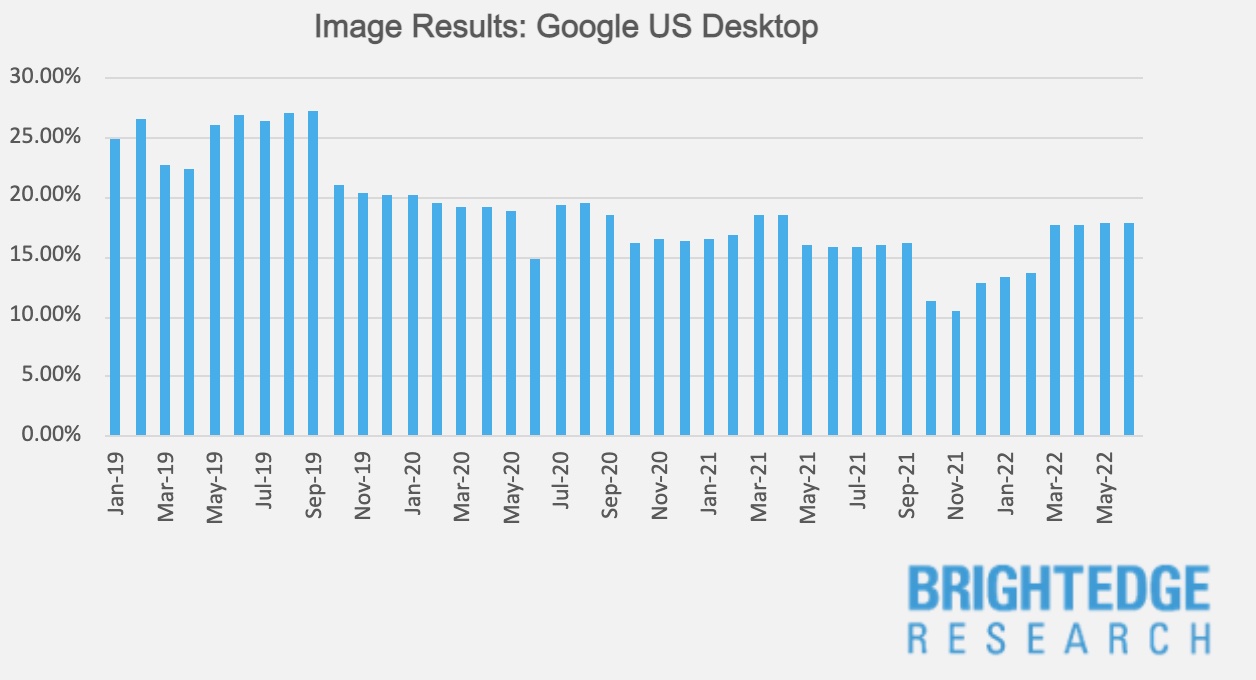- Images – Results frequency on desktop are trending up since a 3-year low in November 2021 and are now at their highest level in over a year. Image results on mobile continue to trend downward and are now at their lowest point in three years as of June 2022.