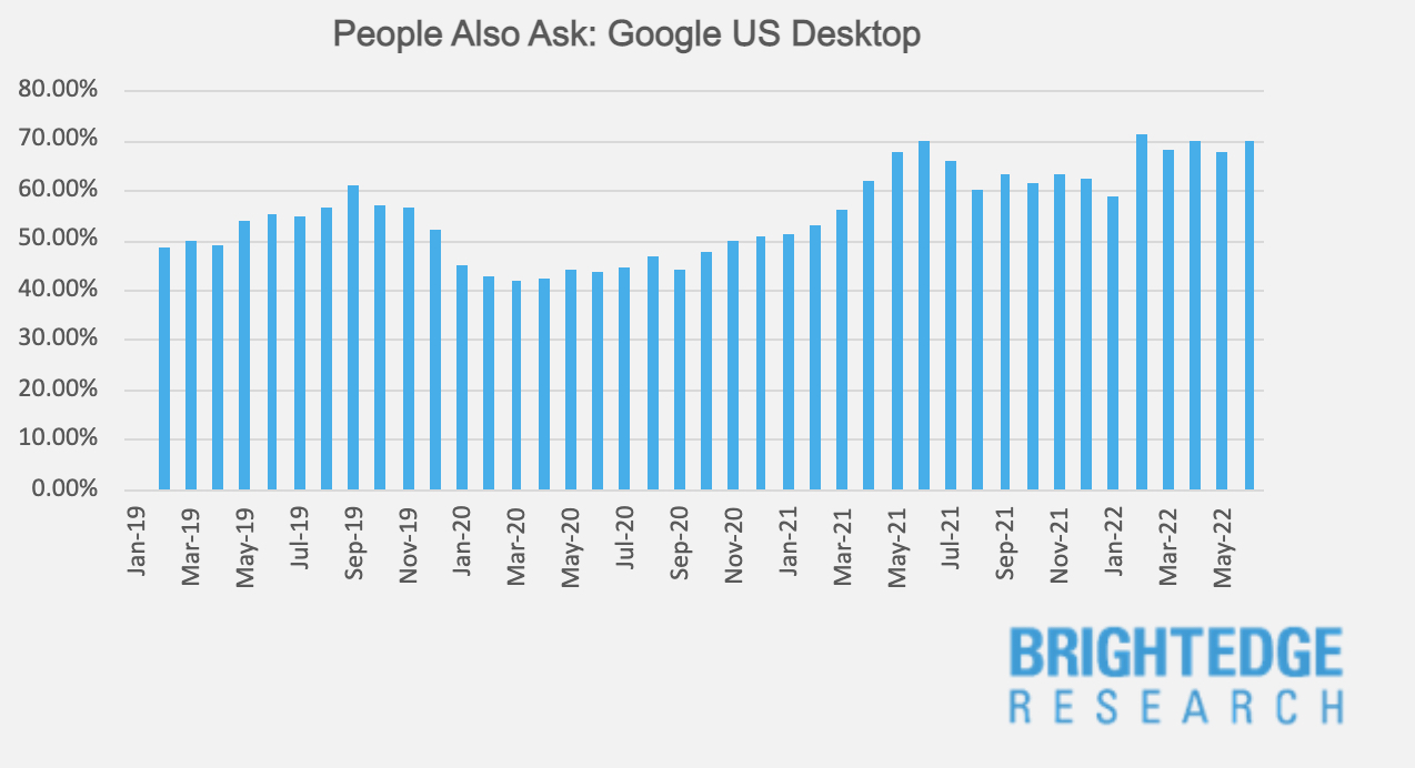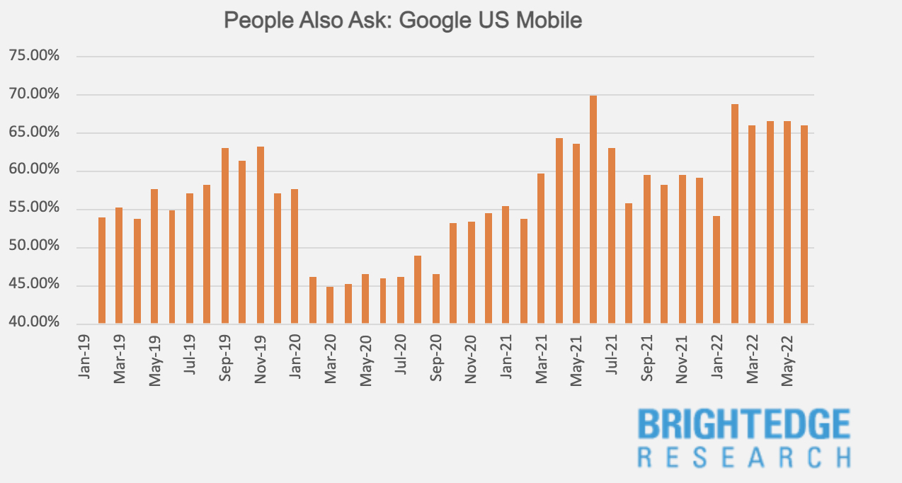 Here, we've seen similar experiences for both desktop and mobile where a February 2020 drop-off led to a slow recovery. The interesting difference being that the drop-off was far more significant on mobile devices. It’s possible that users weren’t interacting as much with this feature, which can quickly take over the entire screen on mobile devices. However, considering the more dramatic increases seen on mobile devices since September of 2020, it would appear that Google is doubling down on changing the mobile user experience to feature the People Also Ask snippet. On both device types, People Also Ask results overcame the dramatic dip in February 2020 to reach record heights in June 2021. After cooling off some in the 6 months following that peak, June 2022 sees People Also Ask results at 70% on desktop, a percentage equal to its highest level in over 3 years, and just below its highest level on mobile at 66%.