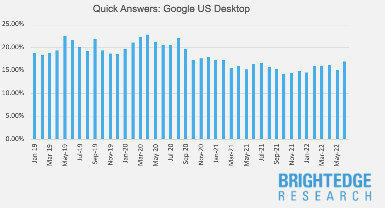 Back in September 2020, Quick Answers dropped down sharply, only showing in roughly 15% of all searches. Since then, the result type has continued to decline, reaching a 3-year low of 14% on desktop and 11% on mobile in October 2021. In February 2022, Quick Answer results showed some sign of recovery inching above 16% on desktop and 12% on mobile where it has been hovering through June 2022.