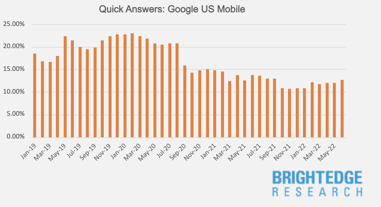 - Quick Answers - September 2020 marked the beginning of a steady decline in Quick Answers across device types, though the downward trend was steeper for mobile. This downward trend bottomed out in October 2021, and began trending up in February 2022, current levels are closer to recovering to similar year-over-year levels.