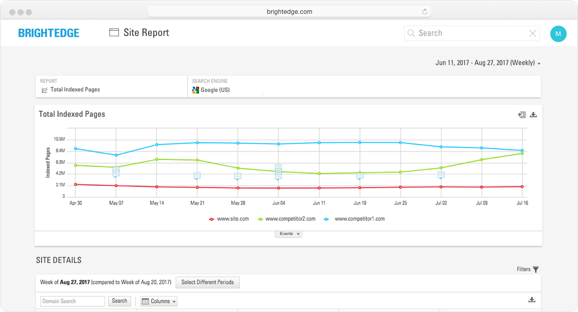 See the number of indexed pages over time for your site and your competitors’ sites. Identify and address content or technical issues to ensure all your pages are discovered by search engines.