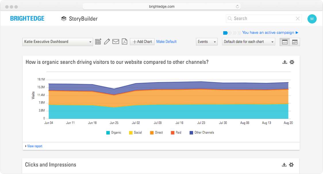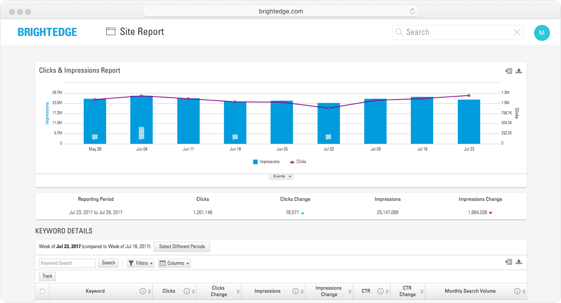 From Site Report, you can easily add a chart or table to StoryBuilder to customize your dashboards. Site Report also gives you quick access to Keyword Reporting or Page Reporting to review SEO recommendations based on keyword or website page.